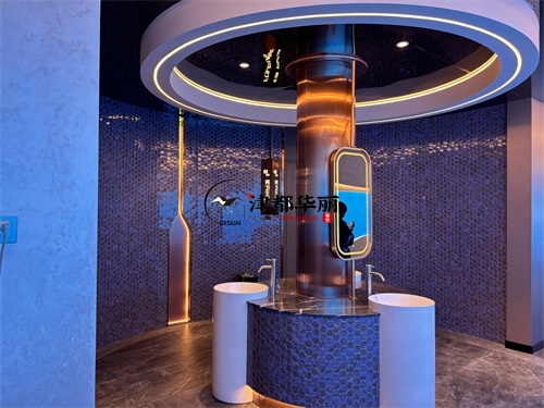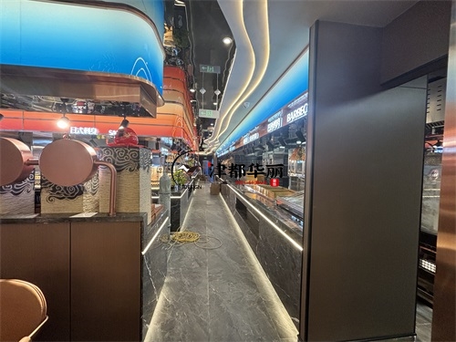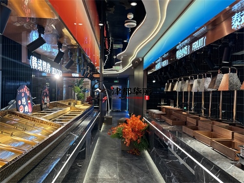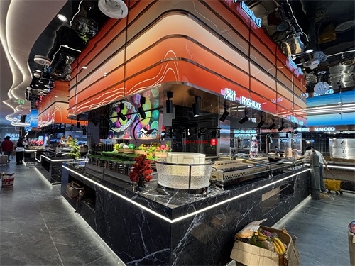 今天分享的是銀川回香漁自助餐廳裝修設(shè)計實景,這家自助餐廳裝修設(shè)計將“潮流科技感”與“輕奢休閑風(fēng)”兩種風(fēng)格巧妙融合在一起,既貼合當(dāng)下年輕消費群體的審美偏好,又通過空間層次的營造兼顧了自助餐飲的功能需求,是近年餐飲空間設(shè)計的典型流行范式。前廳的頂面與墻面采用波浪形的曲面造型,搭配橙紅、寶藍(lán)等高飽和度漸變色彩,疊加內(nèi)嵌式線性燈帶的勾勒,既打破了傳統(tǒng)餐廳的規(guī)整感,又通過科技感的光影營造出“賽博休閑”的氛圍——這種手法既借鑒了網(wǎng)紅餐飲的“打卡屬性”設(shè)計,又通過色彩分區(qū)(如橙紅對應(yīng)熱菜區(qū)、寶藍(lán)對應(yīng)海鮮區(qū))實現(xiàn)了功能引導(dǎo),讓顧客能快速識別餐區(qū)類型。