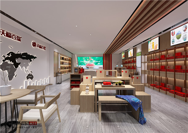 在本展館中設(shè)計師結(jié)合品牌發(fā)展歷程與發(fā)展理念,裝修色彩多以正紅色為主,原木色為點綴,展現(xiàn)出現(xiàn)代質(zhì)感與傳統(tǒng)理念并存的裝修風(fēng)格。頂面石膏板黑色線條封邊吊頂充分的延伸了整體空間視覺感,展館左側(cè)墻體地球的圖案寓意著寧夏的枸杞品牌走出了中國,邁向了世界。